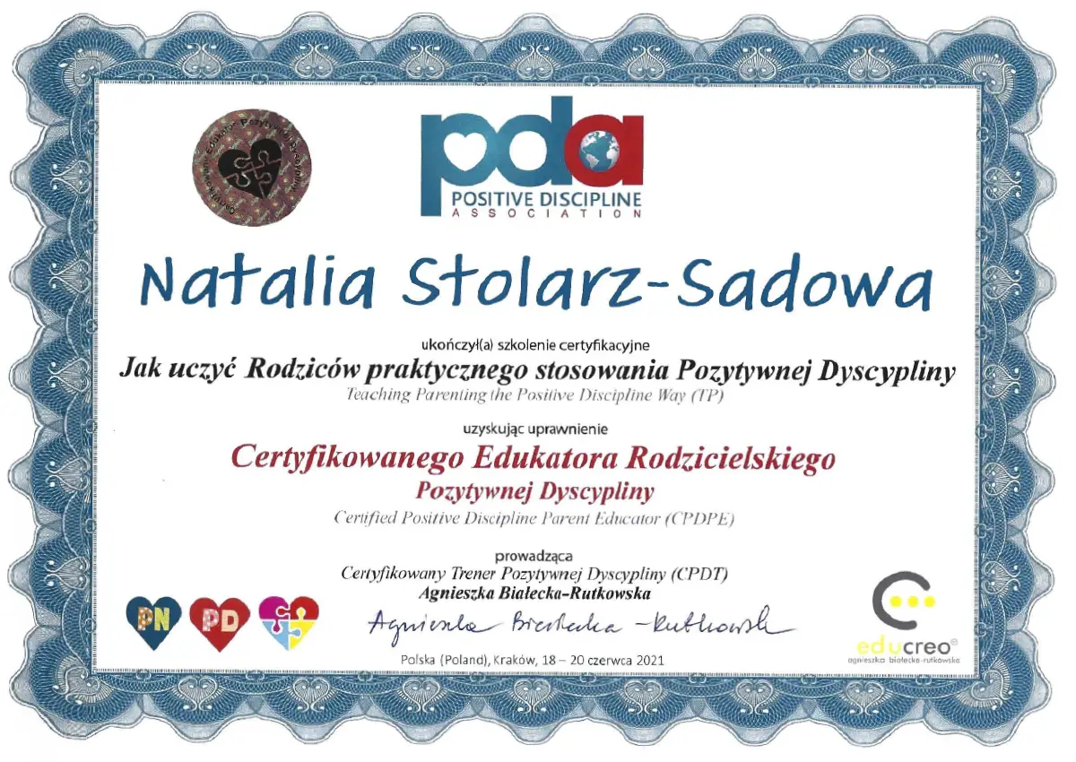 - Certyfikowany Edukator Rodzicielski Pozytywnej Dyscypliny – Educreo i Positive Discipline Association (PDA), 18-20.06.2021 r. » Zobacz Certyfikat «