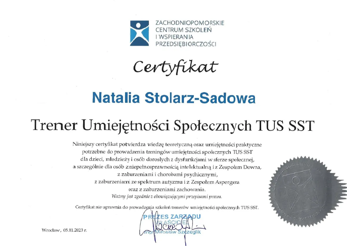 - Trener Umiejętności Społecznych TUS SST – Zachodniopomorskie Centrum Szkoleń iWspierania Przedsiębiorczości, 05.11.2023 r. » Zobacz Certyfikat «