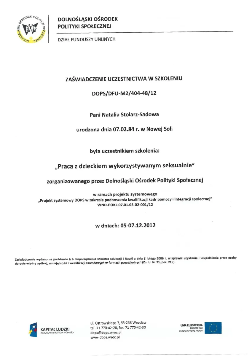 - Praca z dzieckiem wykorzystywanym seksualnie – Dolnośląski Ośrodek Polityki Społecznej, 05-07.12.2012 r. » Zobacz Certyfikat «