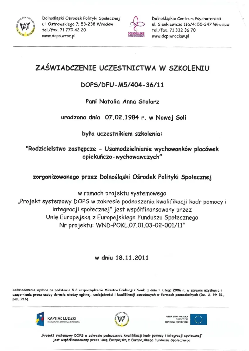 - Rodzicielstwo zastępcze – Usamodzielnianie wychowanków placówek opiekuńczo-wychowawczych – Dolnośląski Ośrodek Polityki Społecznej, 18.11.2011 r. » Zobacz Certyfikat «