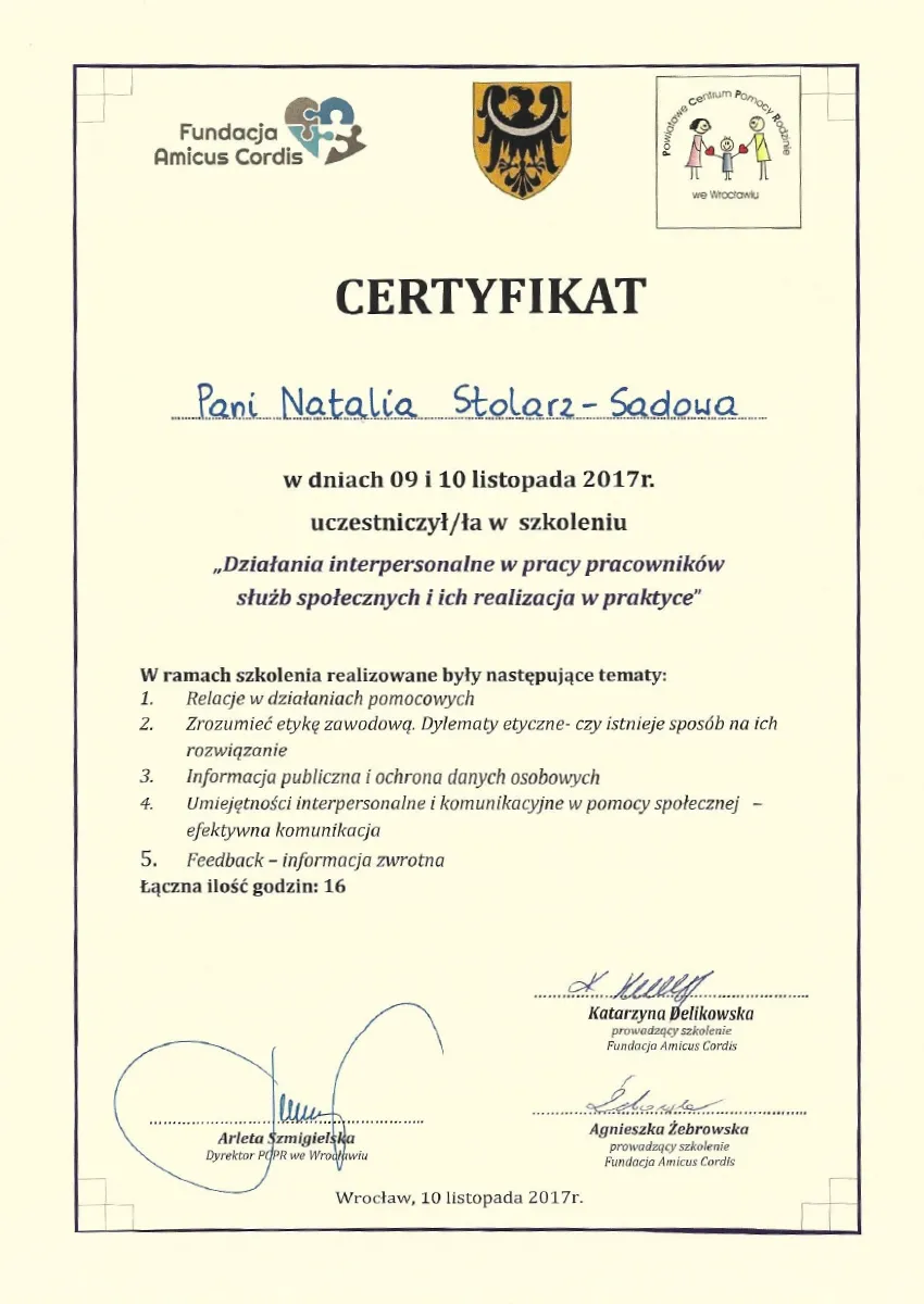 - Działania interpersonalne w pracy pracowników służb społecznych – Fundacja Amicus Cordis,10.11.2017 r. » Zobacz Certyfikat «