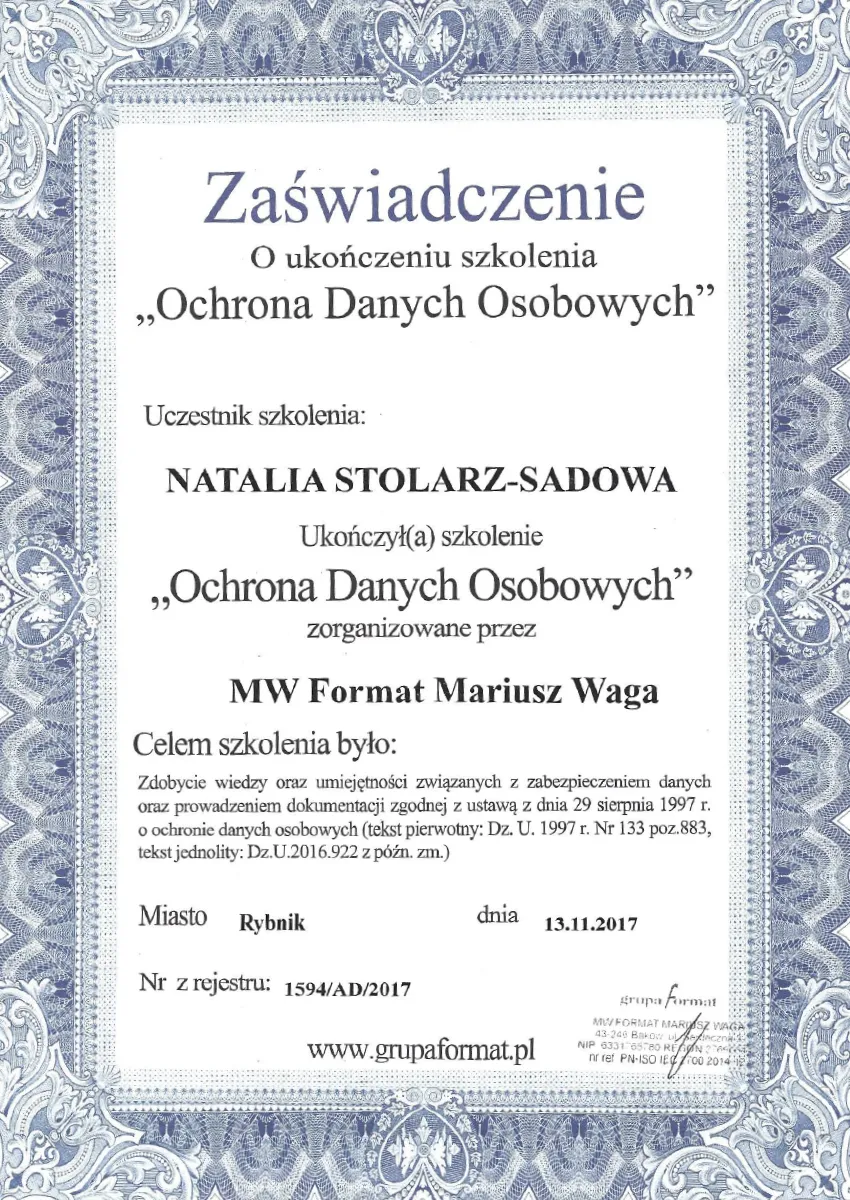 - Ochrona danych osobowych – MW Format Mariusz Waga, 13.11.2017 r. » Zobacz Certyfikat «