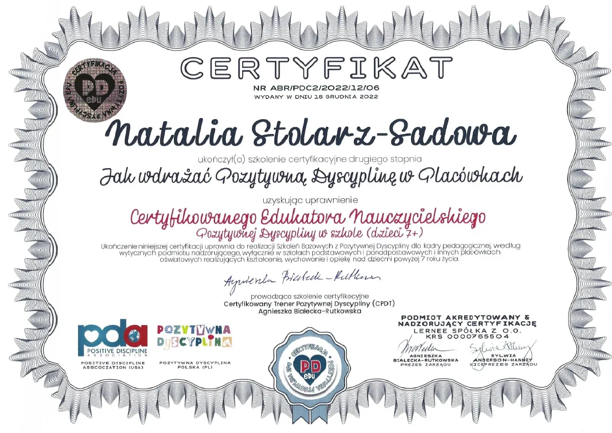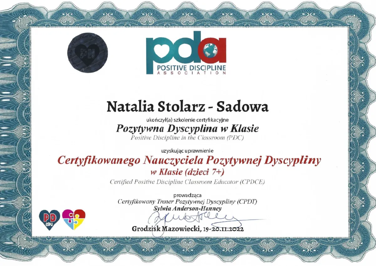 - Certyfikowany Nauczyciel Pozytywnej Dyscypliny w klasie (dzieci 7+) – Sylwia Anderson Hanney i PDA, 19-20.11.2022 r. » Zobacz Certyfikat «