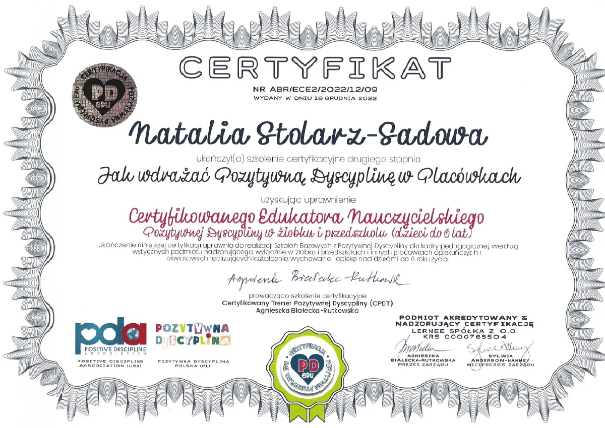- Certyfikowany Edukator Nauczycielski Pozytywnej Dyscypliny w żłobku i przedszkolu – PD EDU i PDA, 18.12.2022 r. » Zobacz Certyfikat «