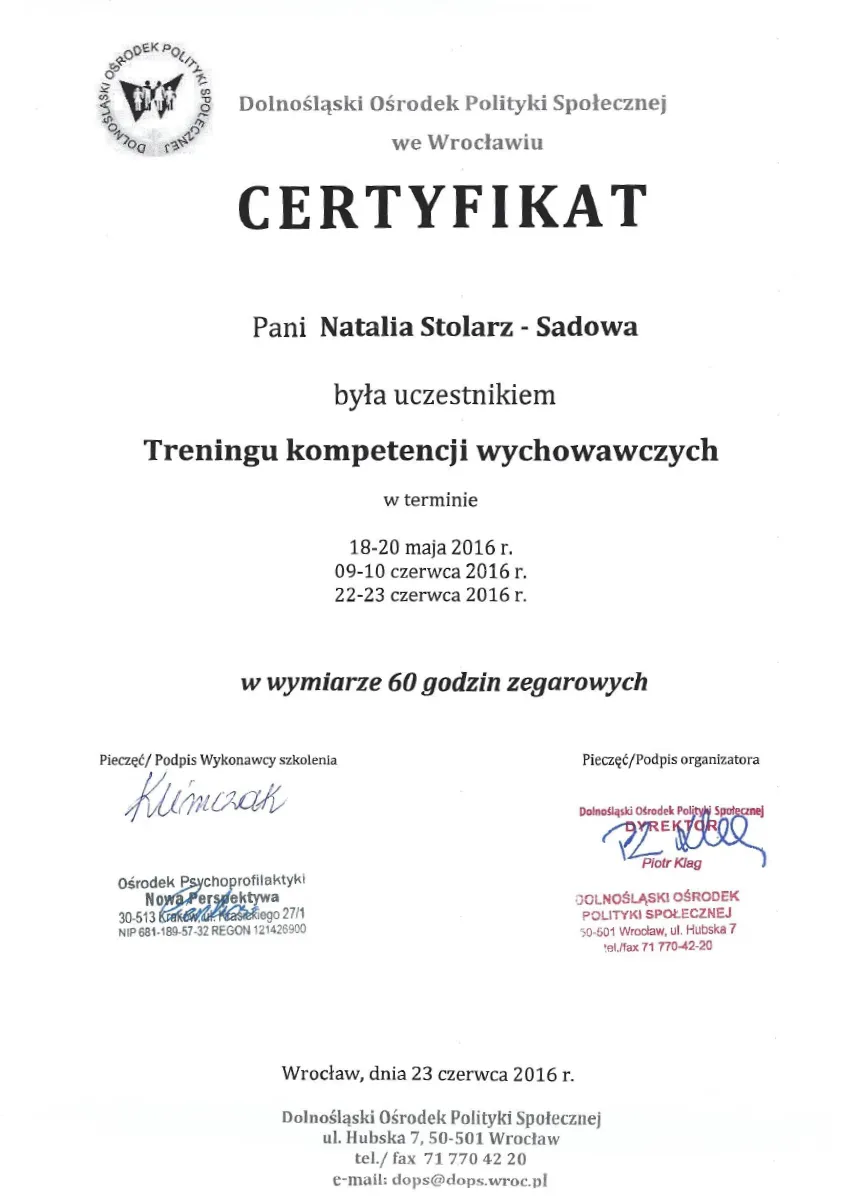 - Trening kompetencji wychowawczych – Dolnośląski Ośrodek Polityki Społecznej, 23.06.2016 r. » Zobacz Certyfikat «