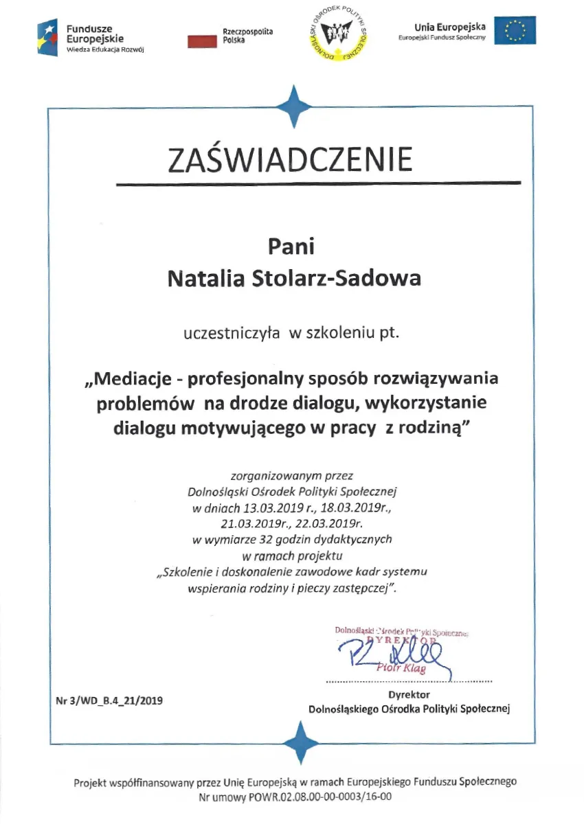 - Mediacje i dialog motywujący w pracy z rodziną – Dolnośląski Ośrodek Polityki Społecznej, 22.03.2019 r. » Zobacz Certyfikat «