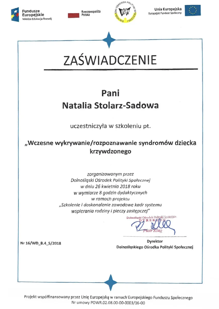 - Rozpoznawanie kryzysu psychicznego oraz syndromów dziecka krzywdzonego – DolnośląskiOśrodek Polityki Społecznej, 26.04.2018 r. » Zobacz Certyfikat «