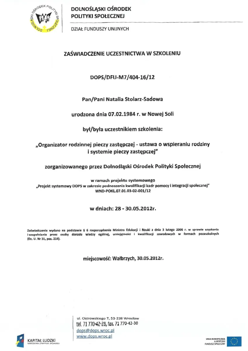 - Organizator Rodzinnej Pieczy Zastępczej – Dolnośląski Ośrodek Polityki Społecznej, 28-30.05.2012 r. » Zobacz Certyfikat «
